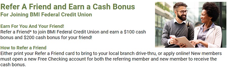 The BMI Federal Credit Union Referral Bonus is easy and simple to earn, just refer your friends and family to the credit union! To find more bonuses, check out BMI Federal Credit Union Promotions. Our full list of banking bonuses can be found here.