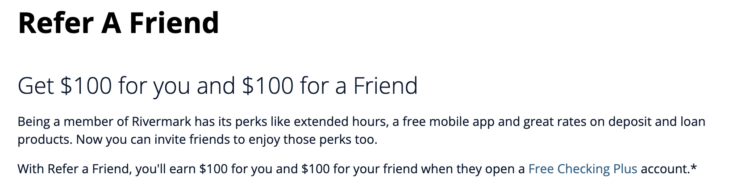 The Rivermark Community Credit Union Referral Bonus is easy and simple to earn once you send your referral link! To find more bonuses, check out Rivermark Community Credit Union Promotions. Our full list of banking bonuses can be found here.